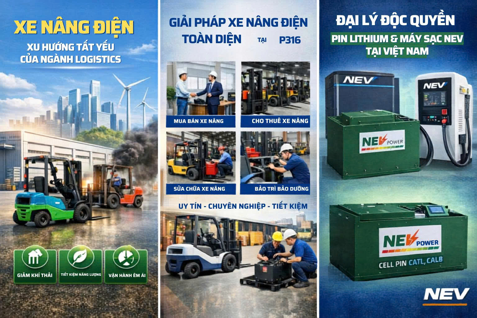 Với các dịch vụ mua bán – cho thuê – sửa chữa – bảo dưỡng xe nâng điện cùng giải pháp pin lithium và máy sạc NEV, P316 sẵn sàng đồng hành cùng doanh nghiệp trong hành trình hiện đại hóa hệ thống kho vận.